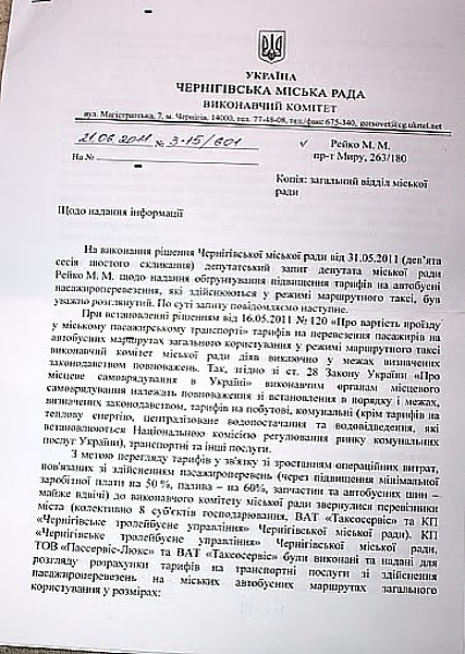 Ці дані містяться у відповіді Чернігівської міської ради на запит депутат Чернігівської міської ради Марини Рейко щодо обґрунтування підвищення вартості проїзду в місті Чернігові.