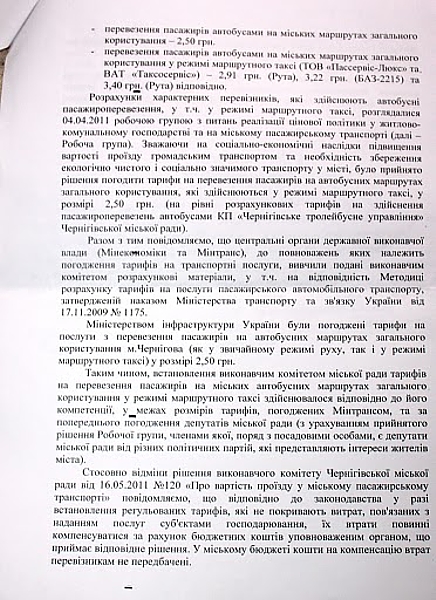 По-друге, показавши економічно обґрунтовані розрахунки на тарифи від 2,90 до 3,40 грн. перевізники (Таксосервіс та Пассервіс) легко погодились на тариф у 2,50. Виникає закономірне питання: чи ці перевізники надали завідомо невірні розрахунки, чи легко і просто відмовились від «економічно обґрунтованого прибутку» на користь чернігівців?
