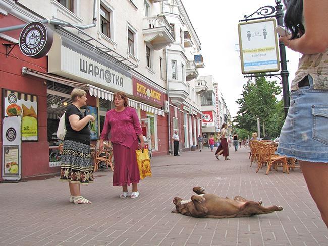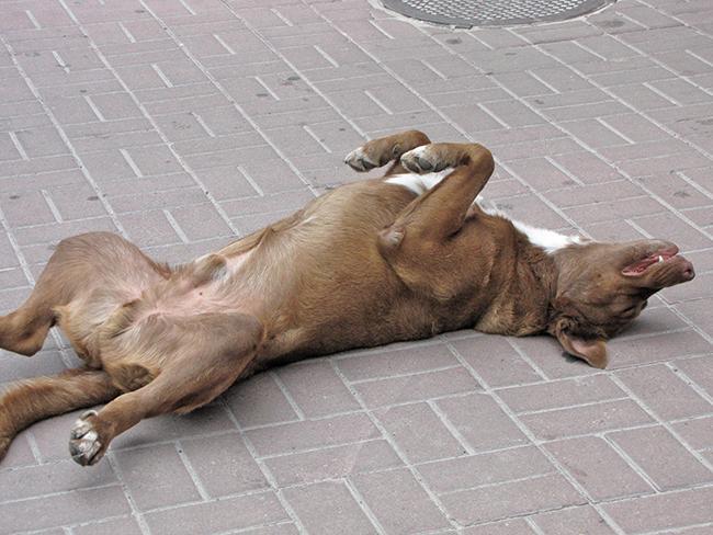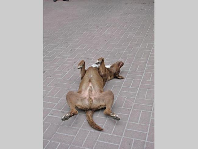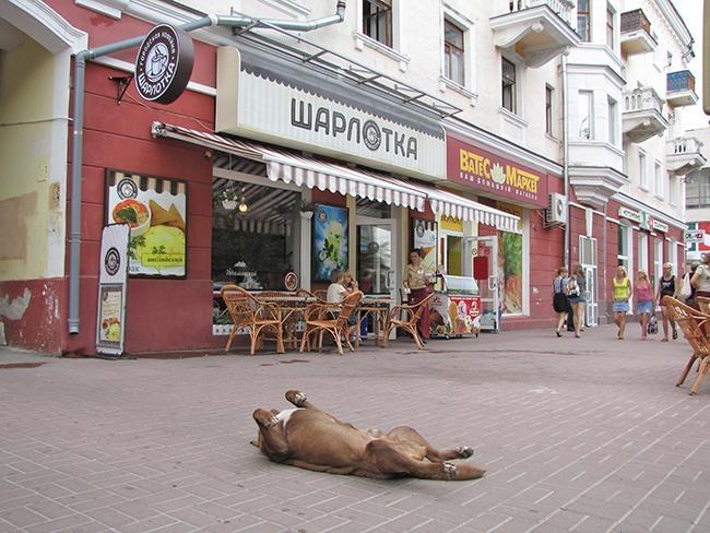 Проходя во вторник мимо городской кофейни «Шарлотка», наблюдал пса, который видимо, потерял надежду найти укрытие от летнего зноя, и развалился прямо на тротуаре в расслабленной позе.
