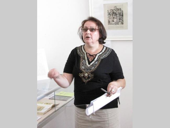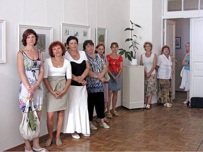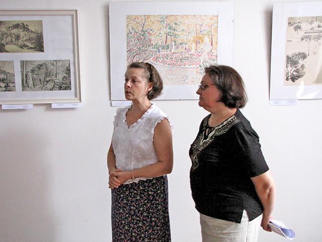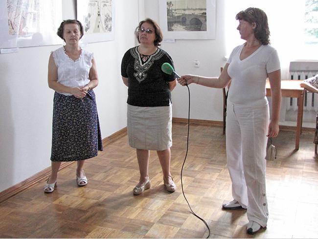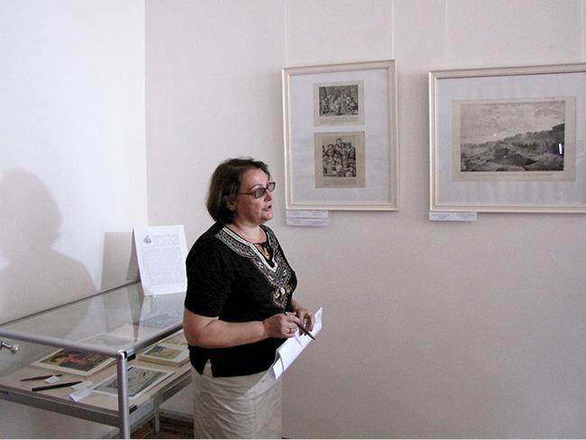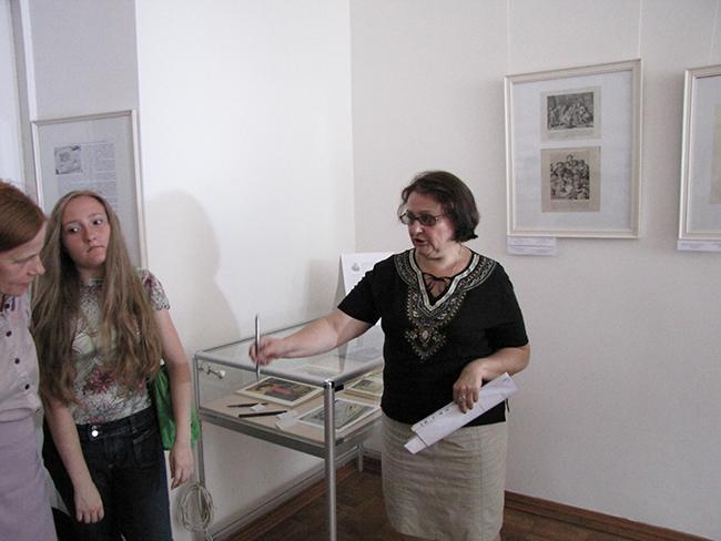 О технике литографии и работах представленных на выставке, рассказала куратор выставки, заведующая сектором зарубежного искусства Вера Александровна Дорошенко, она в совершенстве владеет техникой литографии и на выставке представлено несколько ее работ: «Как правило, рисунок наносится художником на зернистую поверхность камня-известняка черным жирным литографским карандашом. После травления поверхности камня кислотой, которая воздействует на непокрытую жиром поверхность, рисунок смывают. Затем валиком на влажный камень наносится типографская краска, которая пристает к непротравленным участкам камня, точно совпадая с рисунком. Печатают литографию на литографском верстаке».