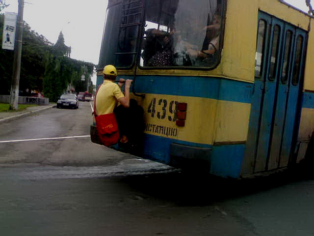 Так, недавно наблюдал картину, которая привлекла внимание всех прохожих и пассажиров троллейбуса. Парень в фирменной униформе, с сумкой с логотипом городской газеты «Из первых рук» пытался подъехать на городском транспорте вот таким необычным способом.