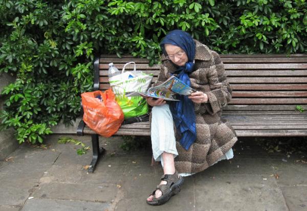 Очевидно, бабушку волнуют проблемы в стране, раз она даже забыла снять летом пальто))