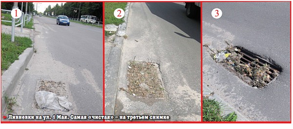 Фотографию первой ливневки от улицы 1 Мая даже и публиковать не стоит: это земляной прямоугольник (с толщиной земли в 5-7 см), который на снимке полностью сливается с серым асфальтом. Земля на решетке ливневки утрамбована до такой степени, что по прочности напоминает асфальт. На следующих ливневках ситуация была немного лучше, но вряд ли вода могла бы стекать через настолько замусоренные решетки.
