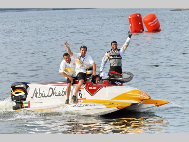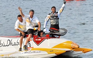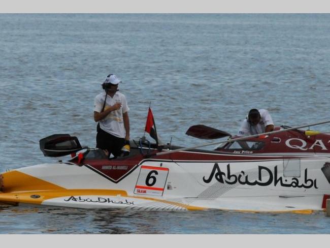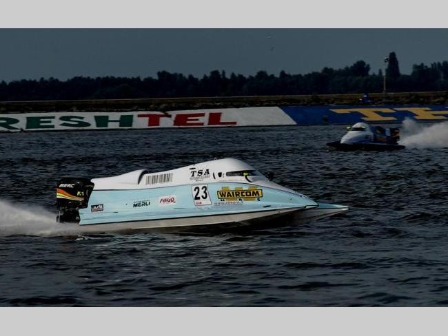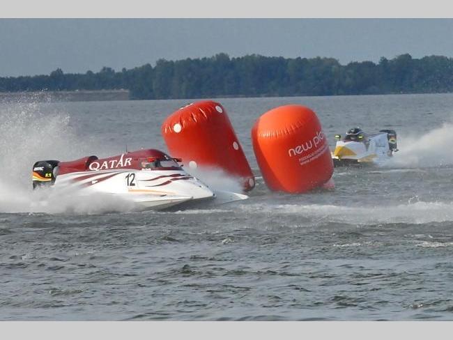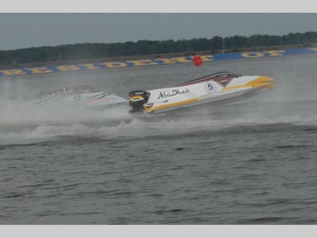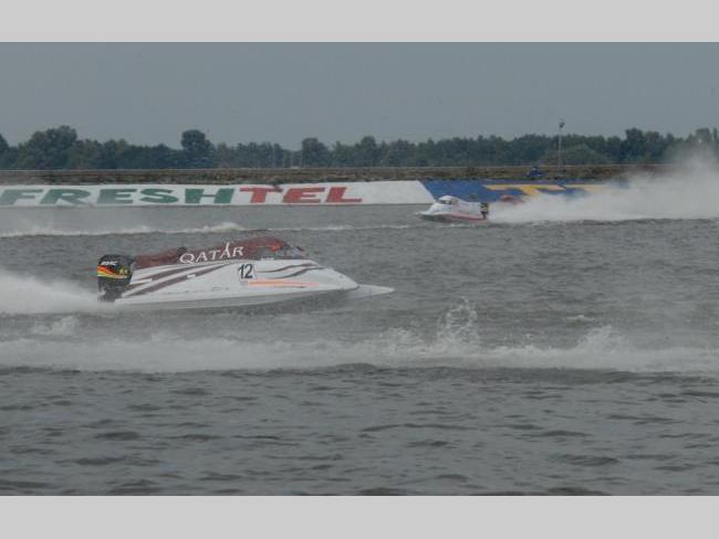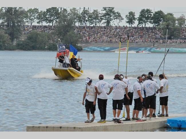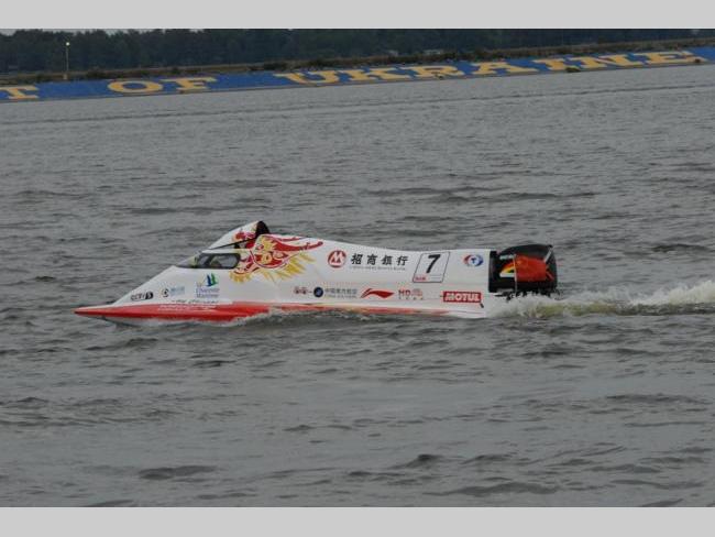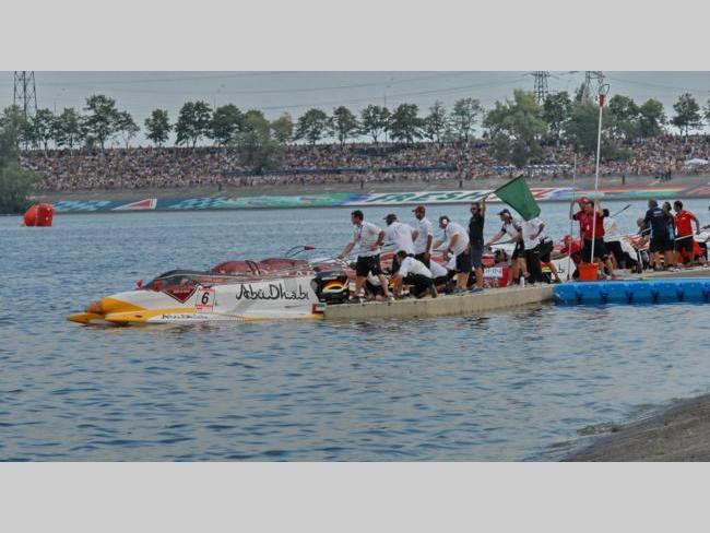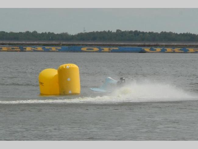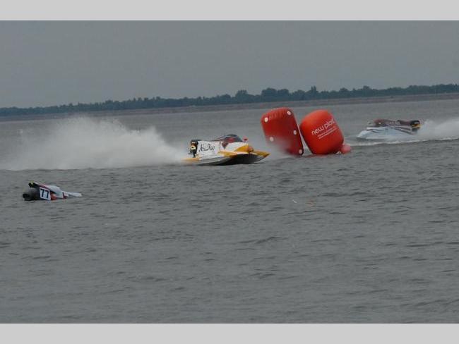 А теперь о гонке. Взмах флажка, взревели моторы, и катамараны рванулись в путь. На первом круге фаворит гонок — один из болидов Абу-Даби — столкнулся с другим участником гонок и потерял шансы на победу на этапе, но его товарищ, Ахмед Аль Хамели уверенно довел второй болид до финиша и завоевал Гран-при "Формулы-1" на воде в Украине.