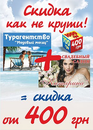 Отправляйтесь в романтическое путешествие с турагентством «Медовый месяц» и получайте скидку от 400 гривен и выше на роскошное свадебное платье в салоне «Катарина»! Чем уникальнее тур - тем привлекательнее скидка на платье! Или же приобретайте платье вашей мечты в салоне « Катарина » и отправляйтесь в романтическое путешествие со скидкой. Размер скидки определяет стоимость выбранного Вами тура.