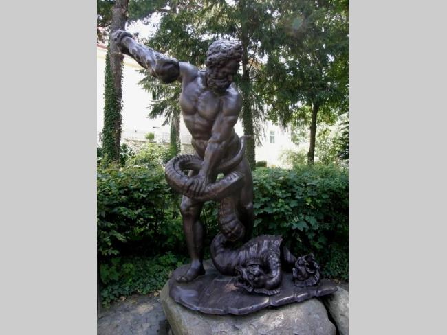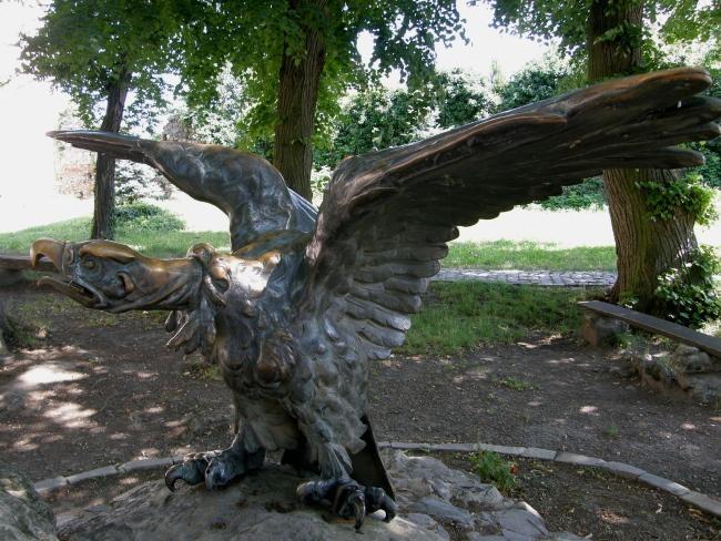При входе на территорию замка первое, что попадается на глаза – статуя могучего железного Геракла, который вот-вот одолеет ядовитую Лернейскую гидру. Чуть далее – фигура покровителя торговли и путешественников Гермеса-Меркурия. Еще одна интересная скульптура, украшающая замковый двор – Турул (сокол), который взлетает. Для венгров, долгое время владевших Закарпатьем, турул был своеобразным символом героизма. В 1703 г., согласно легенде, именно турул принес саблю князю Ракоци, а вместе с ней и победу над австрийскими войсками.