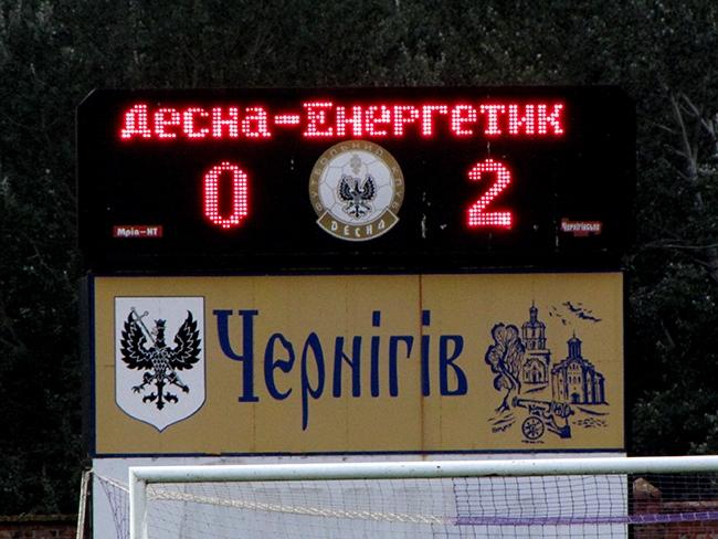 Первый тайм начался с атак хозяев, но все они умело нейтрализовались защитниками гостей. А бурштинцы к концу первой половины встречи выровняли игру, и уже на 35 минуте только перекладина спасает черниговчан от неминуемого гола. Через пять минут, в штрафной площадке «Десны», мяч рикошетом попадает в руку Александра Брыля, и судья показал на 11-метровую отметку. Евгений Ширяев парировал удар Игоря Семенина, но прямо ему в ноги, и во второй раз Игорь не ошибся. «Энергетик» повел в счете 1:0.