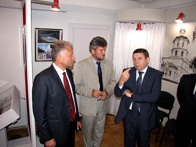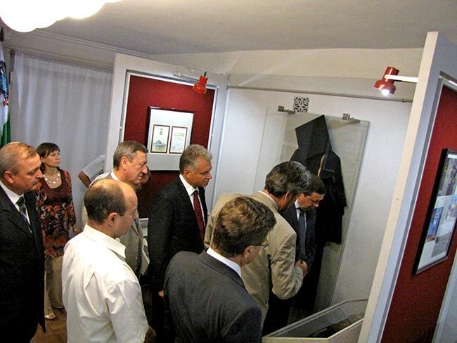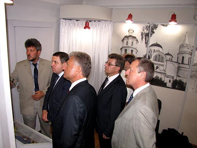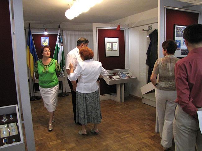 Директор музею Сергій Лаєвський провів для почесних гостей екскурсію виставкою, розповівши про представлені на ній матеріали наших земляків, які відігравали помітну роль у процесі державотворення, сприяли створенню позитивного іміджу України на міжнародній арені.