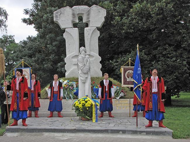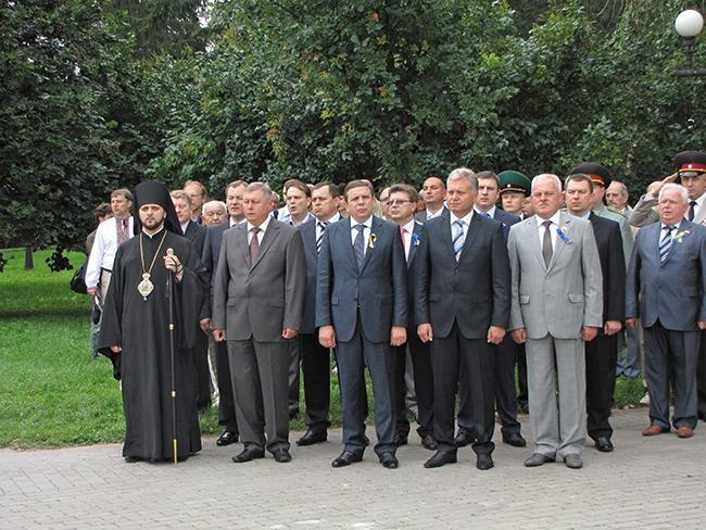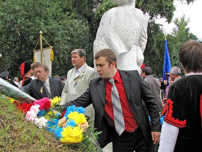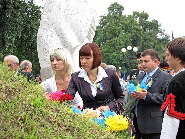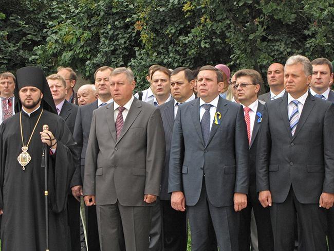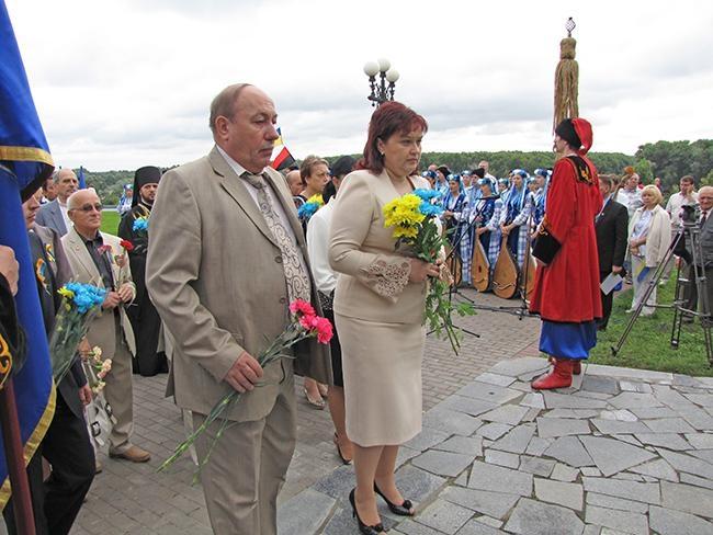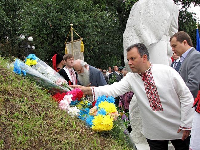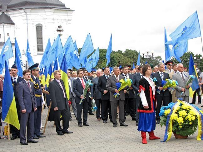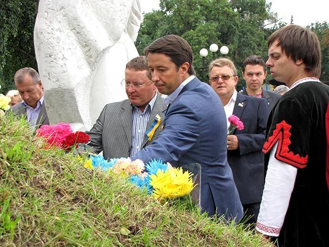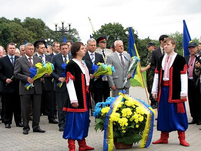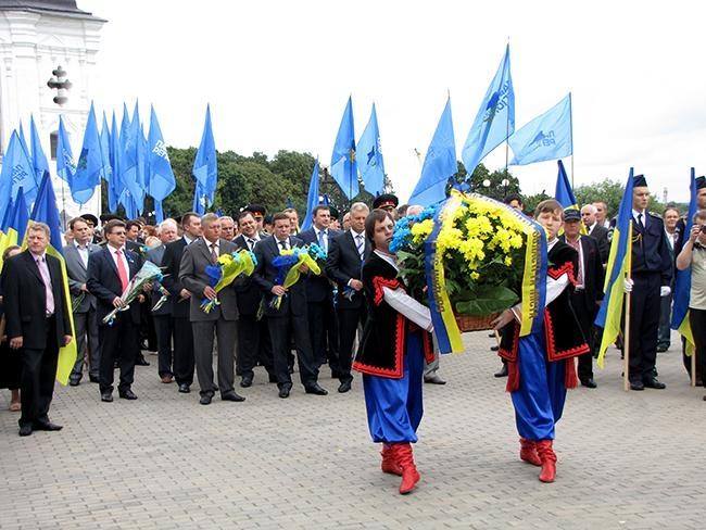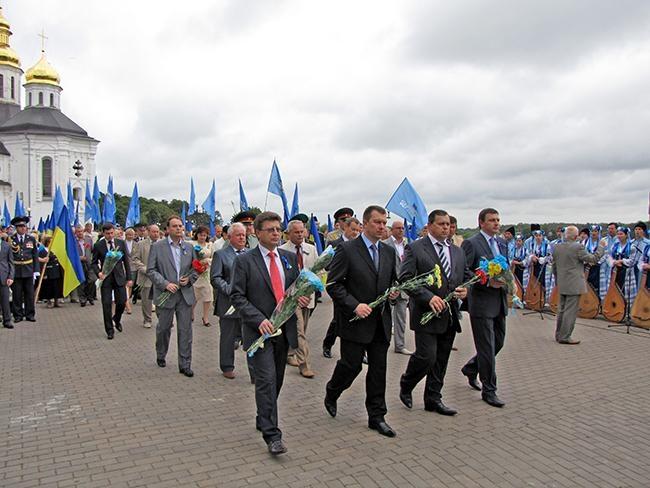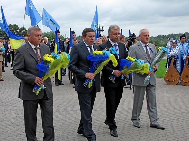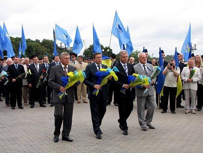 После молитвы за Украину и возложения цветов к памятнику Тарасу Шевченко, делегация во главе с областными и городскими руководителями в плотном окружении знаменосцев Партии Регионов отправилась к Памятному знаку Борцам за свободу Украины. Здесь в торжественной обстановке состоялась церемония возложения цветов к Памятному знаку.