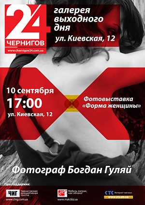 В галерее будет представлена персональная выставка черниговского фотографа Богдана Гуляя – «Форма женщины». Все работы выполнены в стиле ню и напечатаны вручную, серебряно-желатиновой печатью.