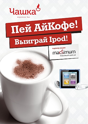 Среди сентябрьских «чашечных кофеманов» будут разыгрываться фирменные чашки, чехлы, сумки, аксессуары... «Чашка» дарит то, что на самом деле полезно, и то, что нравится! А главный приз акции — iPod Nano, цифровой аудиоплеер, выпущенный компанией Apple. Ведь «Чашка» действительно любит хорошую музыку, а iPod — это именно то, что нужно для качественного звука!