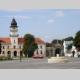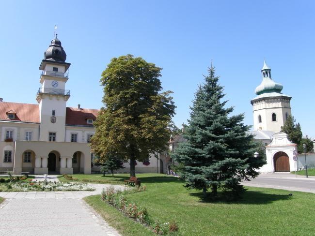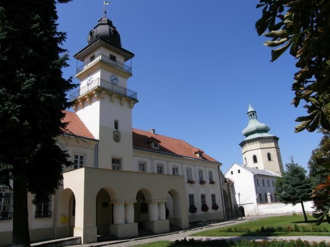 Непосредственно к замку прилегает площадь Рынок - прямо как во Львове, окруженная со всех сторон торговыми рядами и разноцветными средневековыми каменными домиками. Под арками их торговых галерей когда-то бойко шла торговля. Здесь же рядом находится городская ратуша, возведенная на месте более древней в 1932 г.