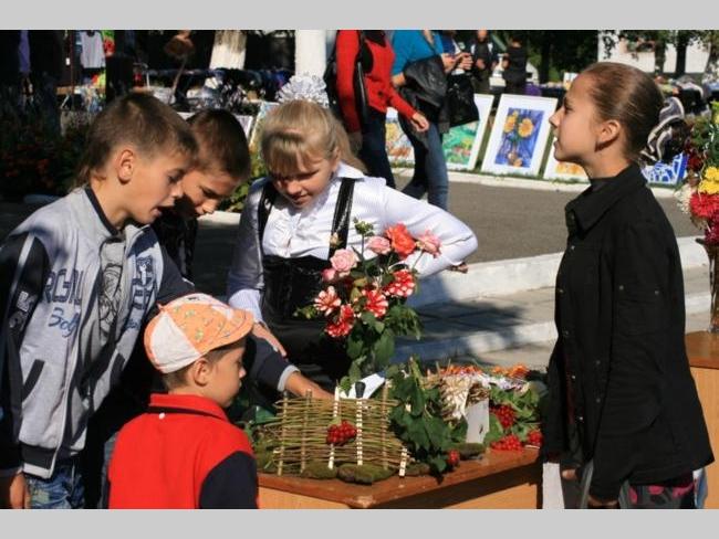 На площі перед будинком культури діти демонстрували виготовлені власноруч декоративні експозиції з нагоди свята, а також малюнки на героїко-патріотичну тематику.