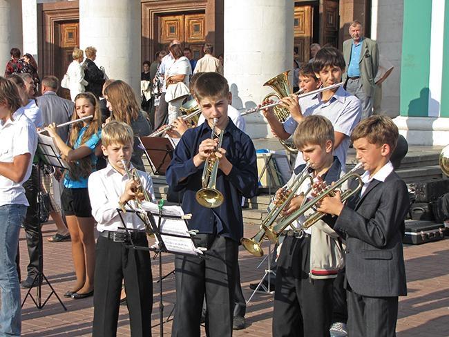 Біля театру, мешканців та гостей міста, зустрічав дитячий духовий оркестр виконанням мелодій воєнних років. Чернігівці та гості міста, серед яких чимало сивочолих ветеранів, повністю заповнили залу драмтеатру.
