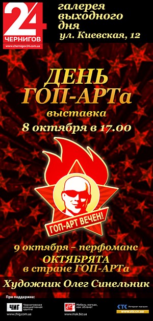 Итак, 8 октября 17.00 – открытие выставки, сопровождаемое приятными сюрпризами от Синельника – подарками и боди-артом. Второй день работы выставки 9 октября 10.00 – 17.00 – в этот же день, по случаю Дня художника, на выставке будет проходить перфоманс "Октябрята в стране ГОП-АРТа".