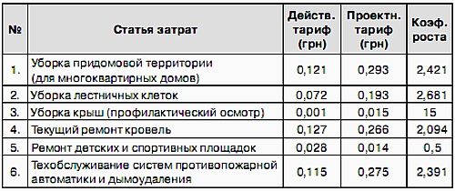 Значительно возрастает стоимость уборки придомовой территории (коэф. 2,421). Сегодня мы платим 0,121 грн/м2, а в новых тарифах предлагается 0,293 грн/м2. Нужно отметить, что при этом некоторые позиции добавились или изменилась их периодичность. Так, например: