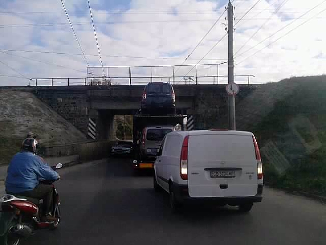 На Подусовке фура с машинами пыталась проехать под мостом. В итоге зацепил троллейбусные провода, «прочирил» по машинам и первую примял. Потом сообразил, что что-то не так, и начал сдавать назад.