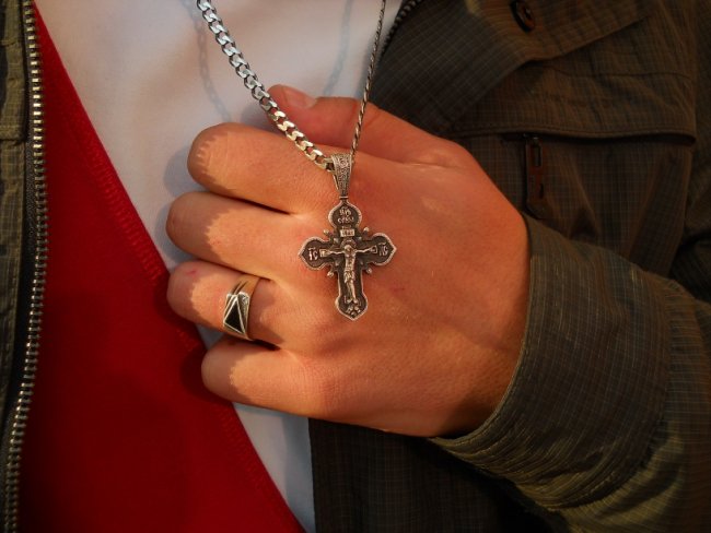 Цепь с крестом и кольцо – серебро. Кольцо – подарок мамы, крест – куплен в церкви (цену не помнит), цепочка – семейное наследие.