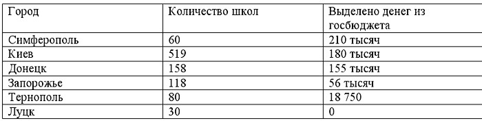 Если поделить эту помощь на количество школ, выходит, что наибольшую помощь выделили школам Симферополя. Одна школа крымской столицы в среднем получила 210 тысяч гривен. Далее Киев – по 180 тысяч гривен на школу, Донецк – по 155 тысяч, Запорожье – по 56 тысяч, Тернополь – по 18 750 гривен.