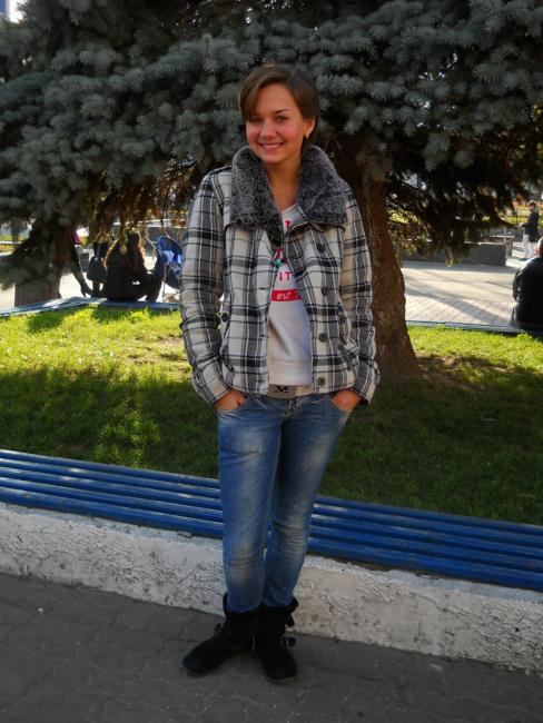 Выпускница 9-й школы. Увлекается стихами – и читает, и пишет. Считает, что одежда должна быть комфортной и выделяющей человека из «толпы». Любимая вещь гардероба – носки с дедом Морозом. Вещи покупает сама, иногда с мамой.