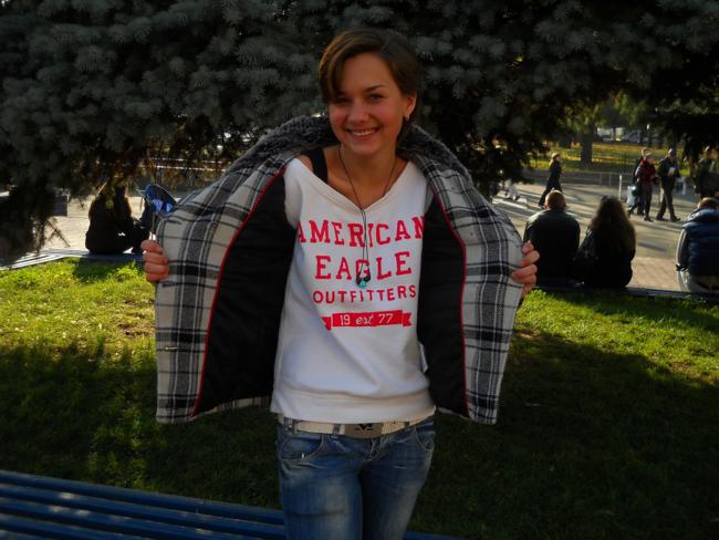 Все покупки по случаю. Покупает, в основном, сама. Иногда советуется с мамой. Мама и главный «спонсор» Насти. Любимая вещь гардероба – этот пиджак-пальто. Настя никогда не наденет платье а-ля Наташа Ростова. Любимый стиль – спортивный, но при случае наденет вечернее платье и туфли на каблуке.