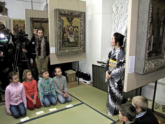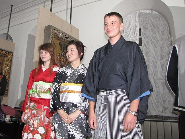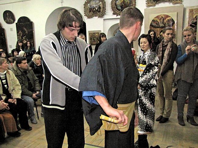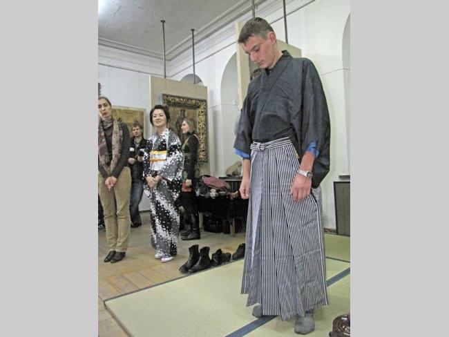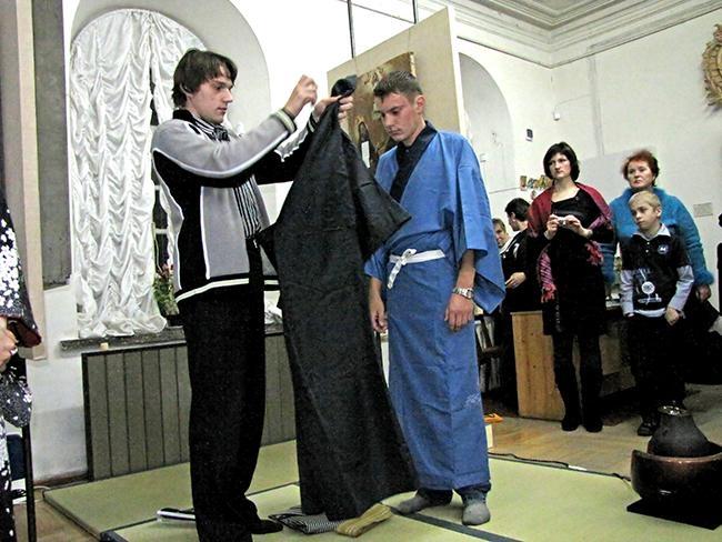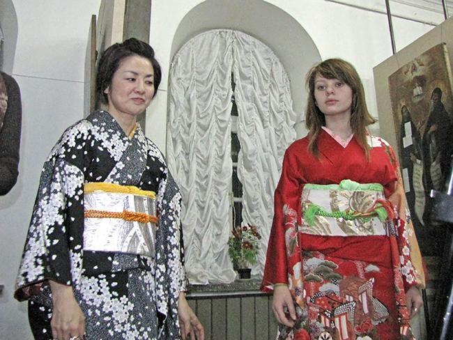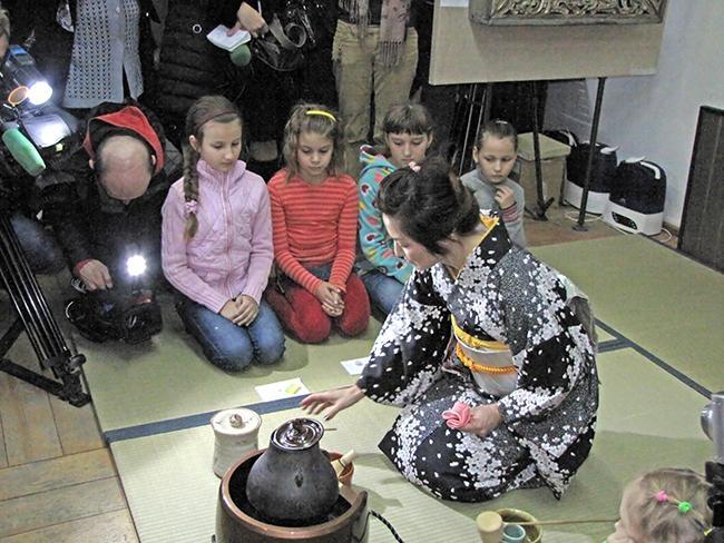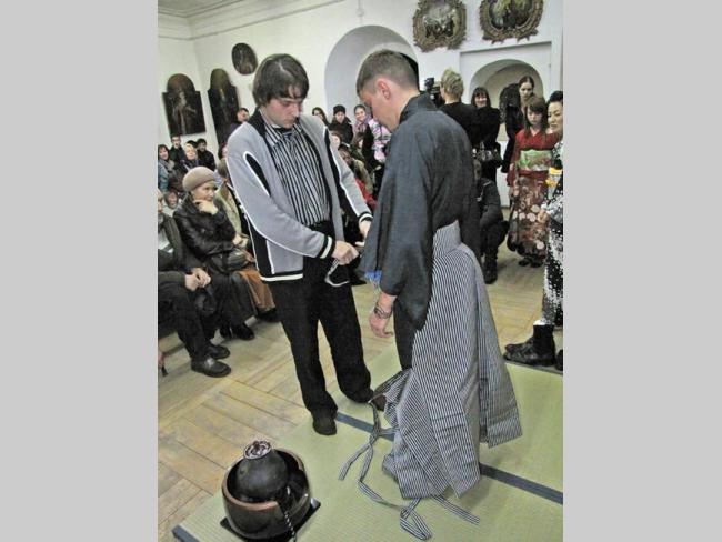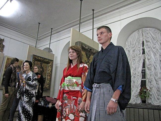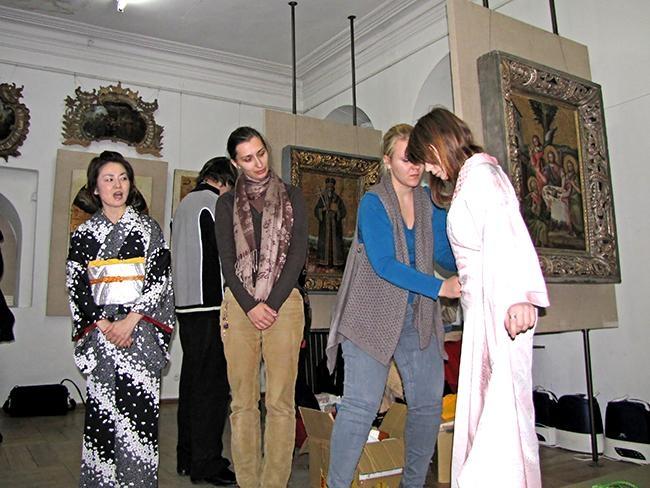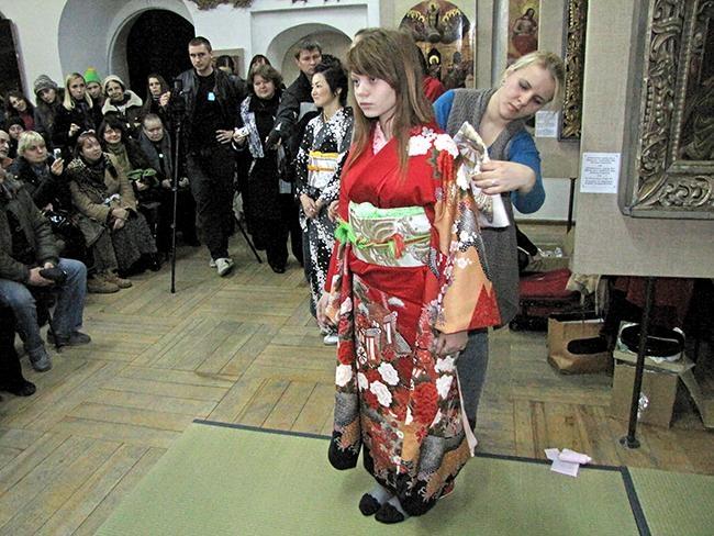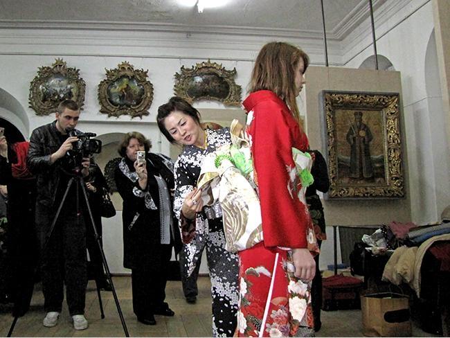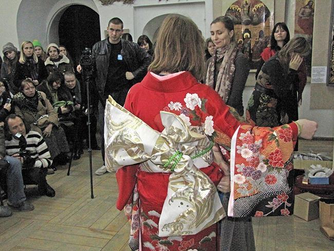 Міяшіро Еміко разом з колегами із Українсько-Японського культурного центру продемонстрували мистецтво одягання японського національного костюму – кімоно. Слід зазначити, що ця процедура не швидка і дуже