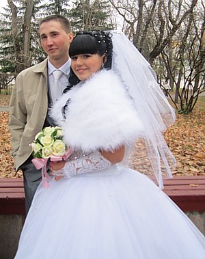 – Одного. Насчет двоих – как получится. На невесте пышное платье, белый полушубок. В прическе белые цветы, на шее — жемчуг, в руках букет из белых и розовых роз.