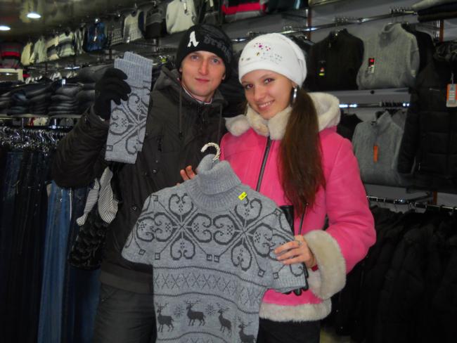 Евгений Коваль и Валентина Гарбузова, приятели: мы все время за покупками ходим в «FASHION». Здесь все нам по карману. Сегодня пришли купить модный удлиненный свитер и шапочку с мишкой. К сожалению, остался только один комплект, но с оленями. Стоит свитер 230 грн. – 70% шерсти.