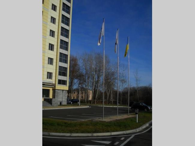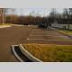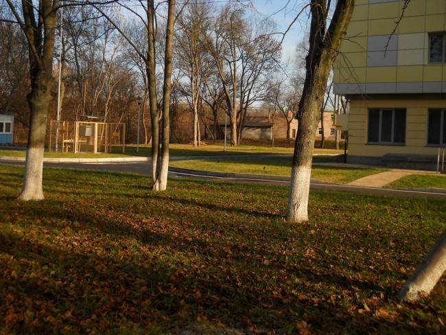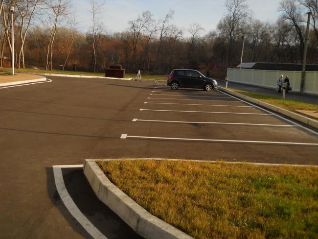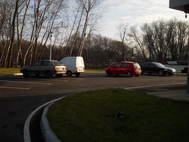 Кругом все окультурено – красиво размеченный асфальт, стоянки для подъезжающего автотранспорта, травяной газон, будочка уличной охраны.