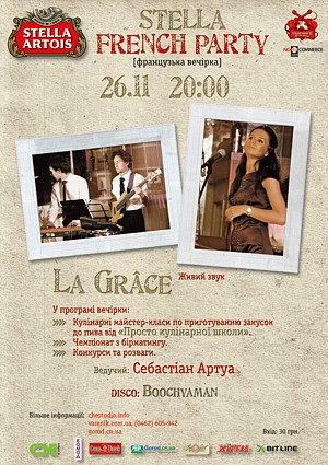 Мета будь-якої тематичної вечірки – надати змогу відвідувачам відчути себе у реальності, якої немає за дверима пабу. Реальність французької вечірки сформує насамперед відповідна музика, як така, що її вмикають з діджейського пульта, так і жива. Ансамбль «La Grâce» з романтичною програмою, що складається з французького шансону та чуттєвих естрадних пісень, жодного не лишить байдужим. Вишукані мелодії цих пісень знайомі багатьом, але те, як співає їх солістка ансамбля Олександра Горідько, доставляє особливу естетичну насолоду.