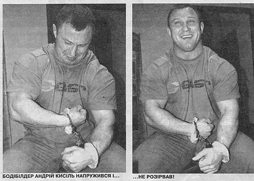 Чемпіон Чернігівської області з бодібілдингу Андрій Кисіль теж пробує наручники на розрив.