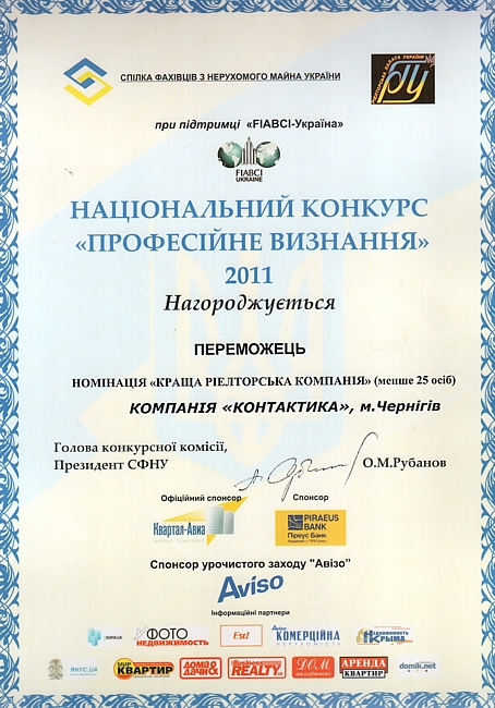 Своєю перемогою «Контактика» довела, що є гідною компанією не тільки на регіональному ринку але й на всеукраїнському. Окрім того, керівник «Контактики» Вікторія Силенко стала лауреатом в номінації «Кращий керівник компанії». Що говорить про високий рівень організації та діяльності бізнесу. - «Найважливіші чинники, якими ми керувалися при створенні та розвитку компанії: було дотримання ріелторської етики та надання висококваліфікованих послуг на ринку нерухомості, показати, що навіть в умовах кризи можна гідно розвиватися та спростувати міф, що все найкраще в столиці. Адже у Чернігові живуть чудові люди і вони в деяких галузях можуть подавати приклад всій Україні», - зазначила пані Вікторія.
