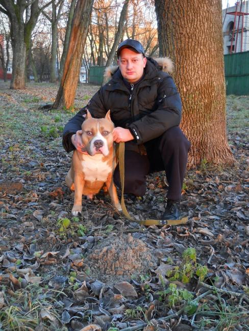 Максим и американский стаффтерьер Шрек: Шреку 3 года и 8 месяцев. Куплен в питомнике, имеет все необходимые документы и множество наград различных выставок. Мама киевлянка, папа – известный «черниговец» по кличке Ахмад. Года полтора занимались воспитанием собаки с инструктором. За занятие платили по 20 гривен. В месяц получалось, примерно, 200. Собаки такой породы с характером, ими особо не покомандуешь. Тем не менее, основные команды знает и выполняет. Агрессивен он только по отношению к собакам бойцовских пород. Проживает с нами в квартире и со всеми ладит, даже с двумя ангорскими котами. Кушает «Проплан» и каши с телятиной, вымя, пьет молоко. Содержание собаки обходится примерно, в 1000 гривен.