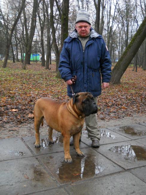 Юрий и бульмастиф Рэй: Рэю 3 года, куплен в Чернигове в КСУ за 5 000 гривен. Когда был маленьким прошел курс дрессировки с инструктором. Все основные команды знает. Собака спокойная, уживается со всеми. Кормим собачим кормом. На содержание уходит гривен 300.