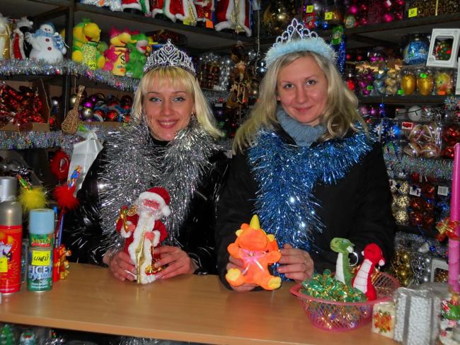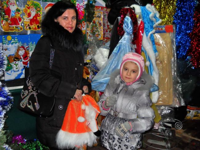 Людмила с дочкой Настей, покупатели: мы купили на рынке новую искусственную елку 2,5 м за 370 грн и теперь подбираем к ней игрушки. Думаем уложиться гривен в 300. Еще смотрим для Насти костюм лисички. Она юная актриса и занимается в драмкружке. Здесь такой костюм есть, стоит 150 гривен. Наверное, будем брать.