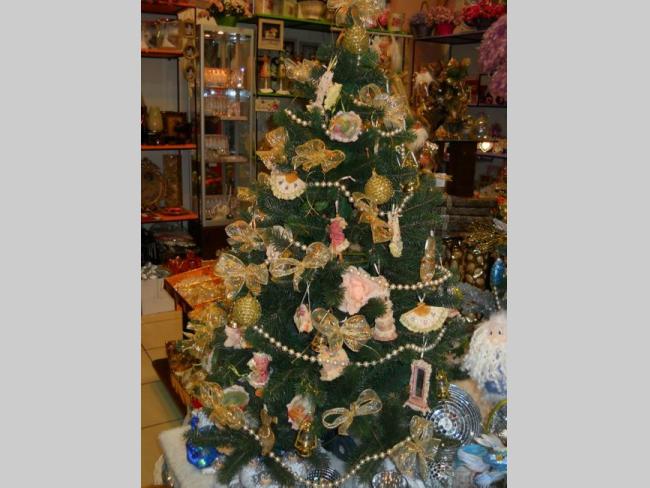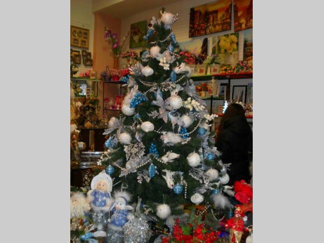 Ему под стать и Новогодние дизайнерские работы бутика – уже украшенные шикарными цветными шарами, две елочки.