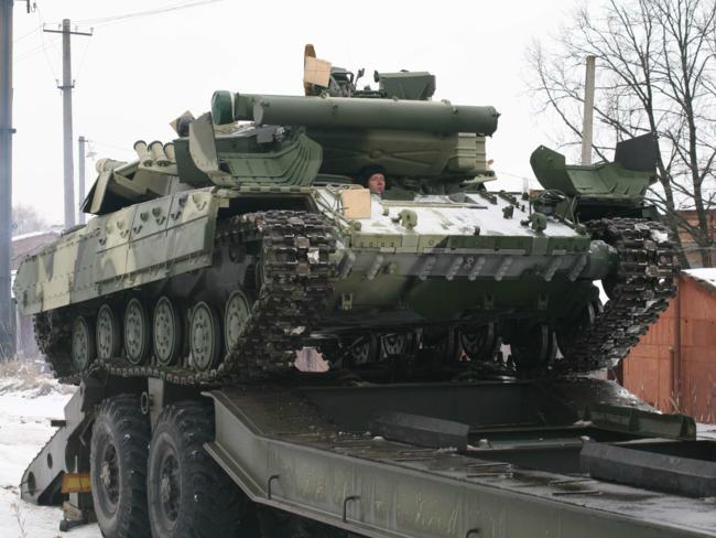 За «Булатами» прибули військові трейлера МАЗ-737. Саме вони доставлять бойові машини до Гончарівського, де дислокується танкова бригада.
