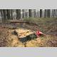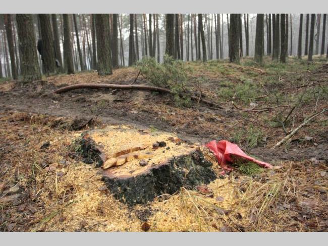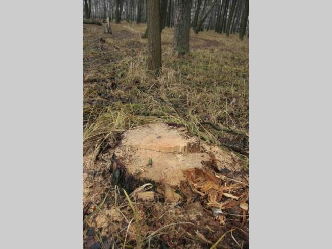 От края платформы в сторону леса вела довольно утоптанная тропинка. Прямо на ней, ближе к опушке леса, мы увидели первые следы порубки. Это был внушительных размеров пень сосны, рядом с которым валялись обрубленные ветки. По характерным кучкам опилок было понятно, что сосну распилили на небольшие поленья тут же, на месте повала.