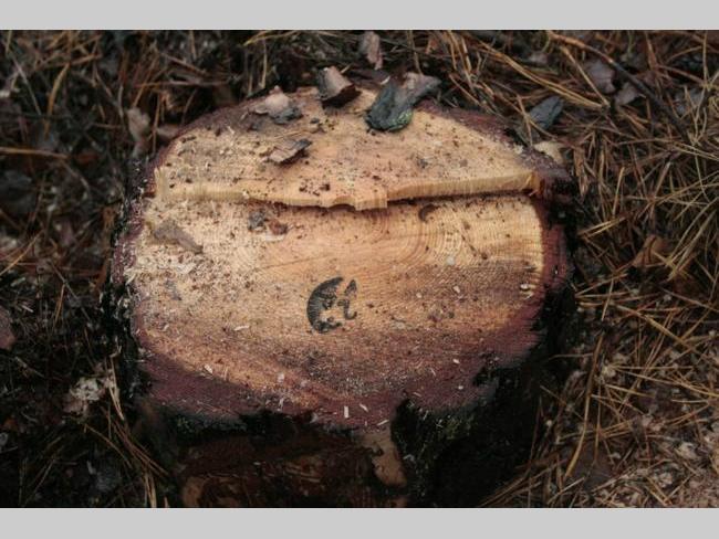 Лесник показал, что валят они только те деревья, которые были помечены специальным клеймом. Отбирали только слабые или поврежденные деревья. После спила дерева на пне в обязательном порядке ставится клеймо, которое подтверждает законность порубки.