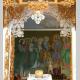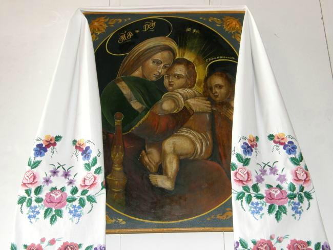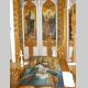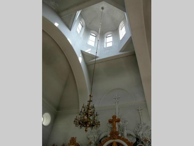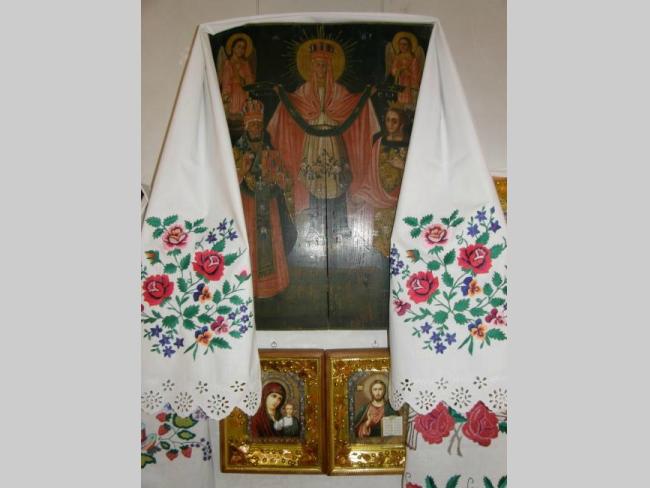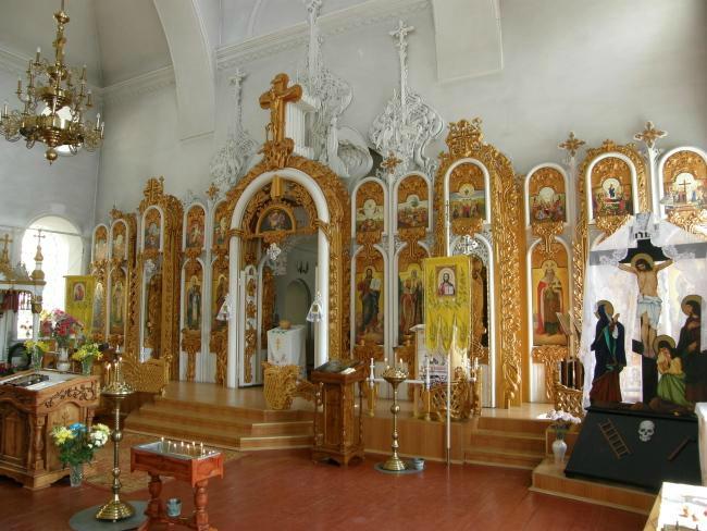Интересно, что в эти же цвета окрашен и сам храм – стены желтого цвета, архитектурные детали – белого. Вместо традиционных изображений винограда и хлебных колосков этот иконостас воспроизводит гроздья калины (без которой, как известно, «нет Украины») и молодую ветвь дуба. Самое же значительное и смелое новшество А.Кошеля в трактовке канонического православного иконостаса – это присутствие на нем объемных, почти скульптурных изображений ангелов, Пресвятой Богородицы и Спасителя на Кресте.