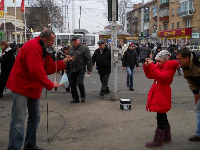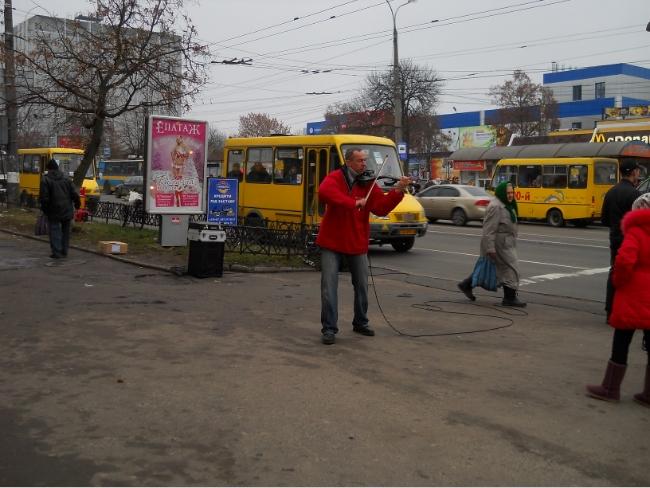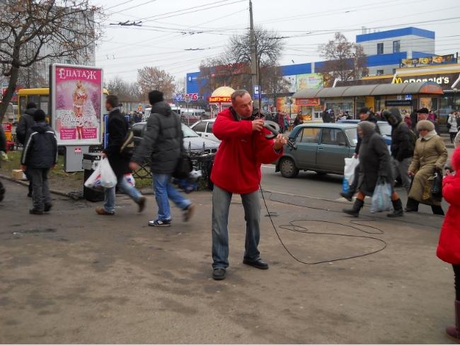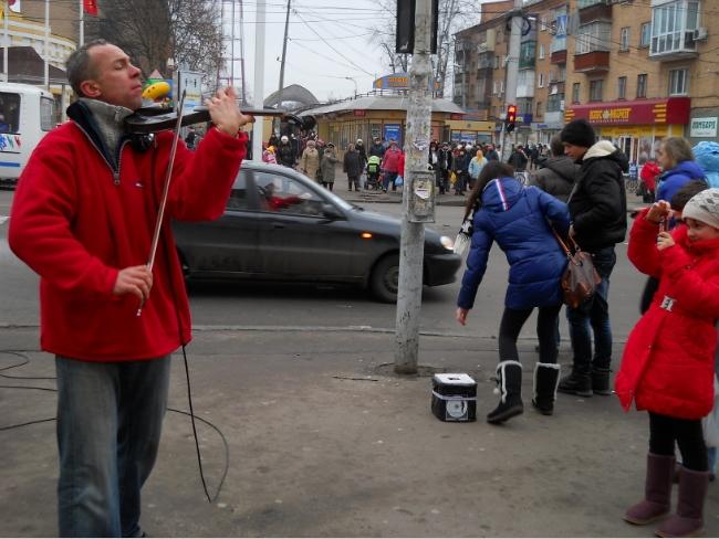 Выходя с Центрального рынка, услышал звуки музыки, доносящиеся со стороны перекрестка. Исполнителем музыкальных произведений оказался мужчина средних лет с необычной, в форме американского доллара, электроскрипкой.