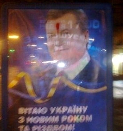 В Чернигове неизвестные, по примеру своих «коллег» из Львовской области, разрисовали уличные лайт-постеры и плакаты с портретом Президента Украины Виктора Януковича, сообщают региональные СМИ. Однако, в отличие от львовских шалунов, обливших портрет синей краской, черниговские протестующие орудовали красной краской и рисовали аккуратные точки на лбу у изображения Президента (см. фото).