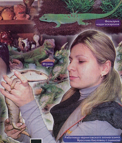 - Конечно есть, - не задумываясь отвечает она. - Это - сцинк. Он очень добрый и спокойный. Любит где-то спрятаться и тихонько сидеть. Недавно мы даже убрали из его террариума домик, потому что он постоянно туда влезал и покупатели не могли его разглядеть. Правда, у сцинка должен быть большой террариум, иначе его тело может деформироваться - искривиться позвоночник или же поломаться хвост. Поскольку места здесь не так много, то стараемся чаще брать его на руки. Он ручной и даже целоваться умеет, - улыбается Ярослава. -А главное - это единственная рептилия, которая узнает своего хозяина, четко знает того, кто ее кормит. Да и вообще, как такие существа могут не нравиться? Два года назад я пришла в этот магазин устраиваться на работу, подержала их в руках и поняла - это мое.