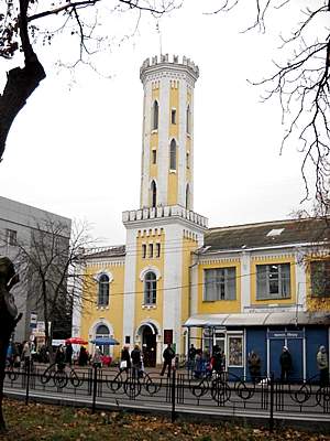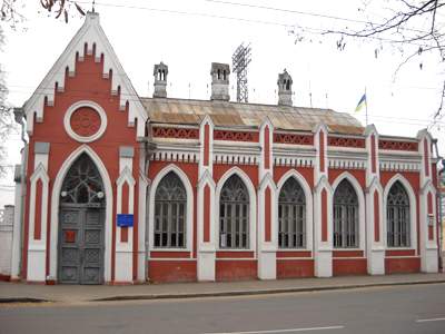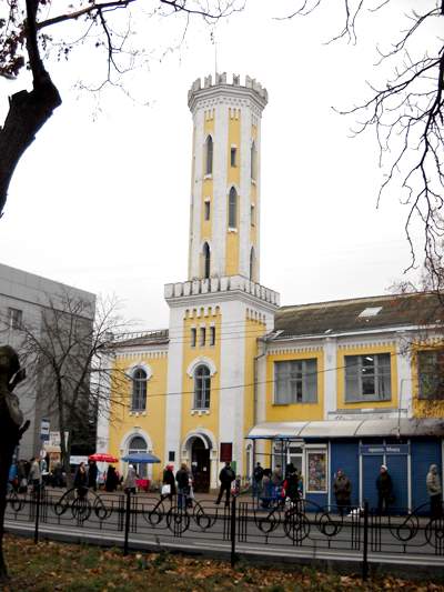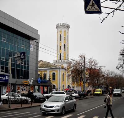 Еще одно творение в готическом стиле невозможно не заметить в центре Чернигова. Это башня бывшей пожарной каланчи, которая диссонирует на фоне железной телевизионной башни. Пожарная часть в областном центре была основана в 1841 году. В начале ХХ столетия для нее был построен дом «Черниговского пожарного общества», состоявший из одноэтажного зала для пожарных машин и двухэтажных служебных помещений с пожарной каланчой, которую завершал деревянный фонарь-сторожка с флюгером в виде флага. Эта каланча и была задумана в неготическом стиле, контрастируя с удлиненным помещением первых двух этажей. Восьмигранная башня с элементами готики в виде зубцов на верхушке и стрельчатыми окнами опирается на четырехугольную башню. В 20-е годы это здание было переоборудовано под типографию. В настоящий момент здесь храм искусства – выставочный зал союза художников Украины – соседствует с частными фирмами и магазинами.