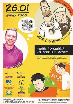 Это не пафосное мероприятие и цель его собрать в 27-й день рождения лучшего Mj Чернигова всех истинных поклонников уже забытого всеми понятия "клубный некоммерческий саунд" и просто хороших друзей, которые появились на протяжении вот уже почти 10-ти летней карьеры Mj Couture.