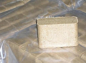 После этого уже готовое сырье попадает под пресс, откуда через конвейер выходит готовый опилкобрикет в форме цилиндра длиной 30 сантиметров. Брикеты фасуются по 5 штук в один тюк, вес которого составляет 10 килограммов.