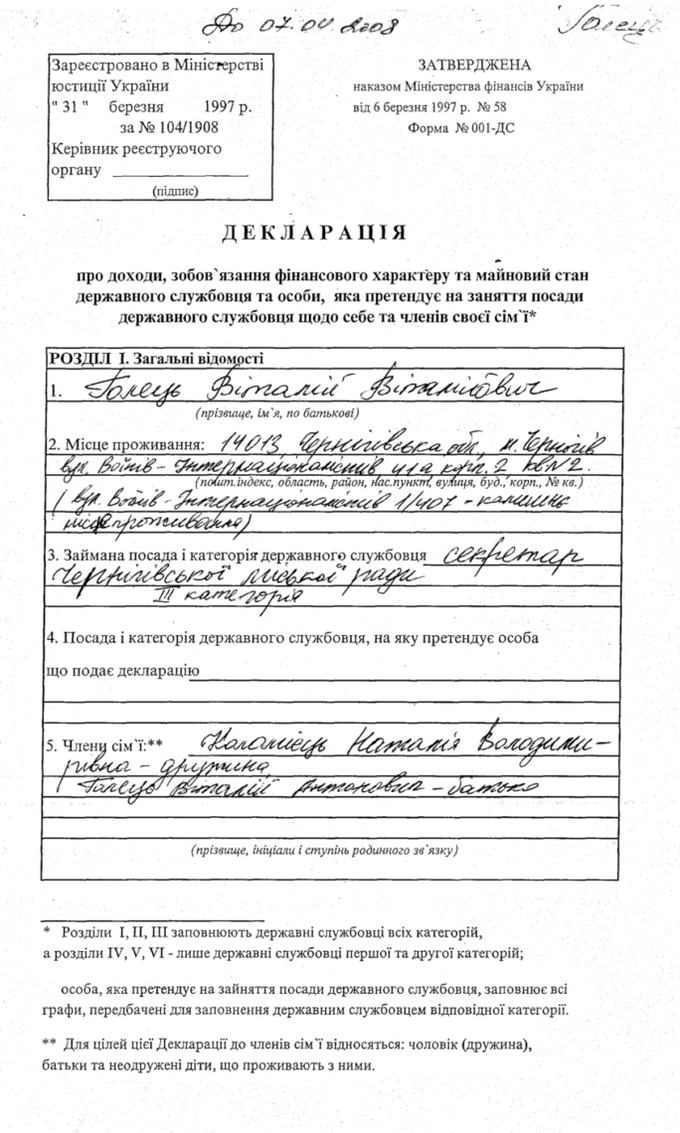 Сегодня секретарь черниговского горсовета Виталий Голец прислал на почтовый адрес редакции сайта Gorod.cn.ua свою декларацию о доходах.