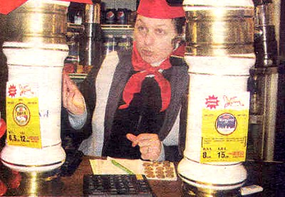 — Коммунистам звонить, — улыбнулась пионерка (она же кассир) 31-летняя Раиса Дзюба, в красном галстуке и пилотке.