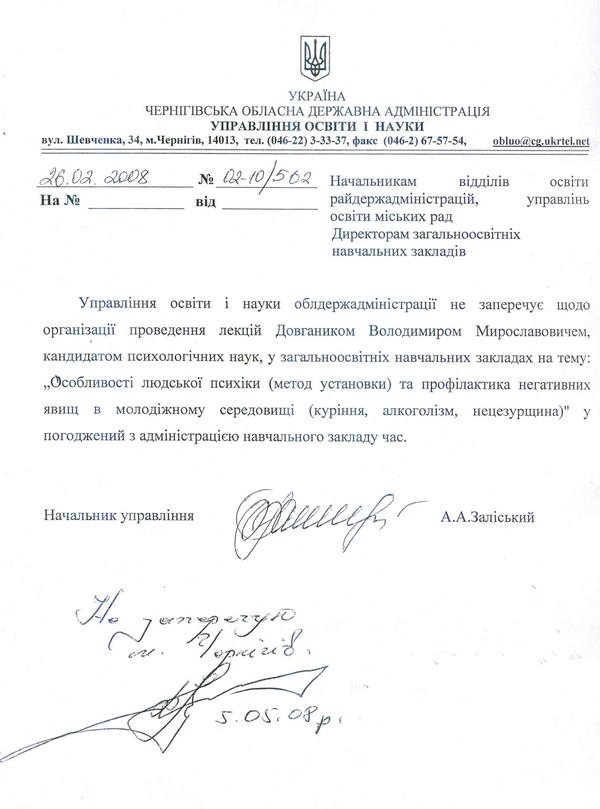 Обзвонив несколько школ, мы обнаружили еще одну, где накануне появился тот же Владимир Довганик и попытался заручиться помощью директора в проведении такого же мероприятия. Причем он даже показал письмо из областного Управления образования, на котором напротив фамилии начальника управления стояла подпись, а в тексте была формулировка «Управління… не заперечує». Так как проведение лекции планировалось на время учебы, то здесь психологу было отказано. Сыграла свою роль и осторожность - к тому времени родители из предыдущего абзаца уже интересовались происшедшим в Управлении образования, а оттуда информация поступила и к директорам.