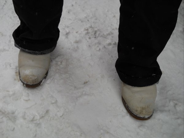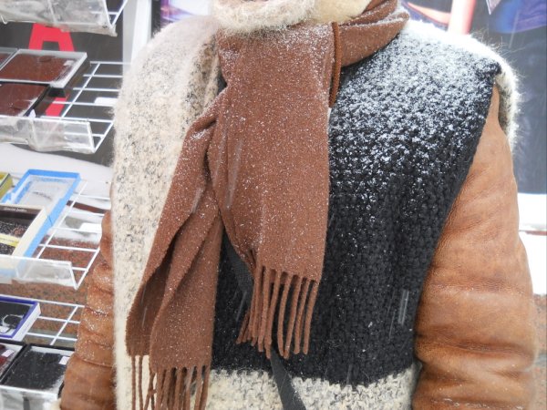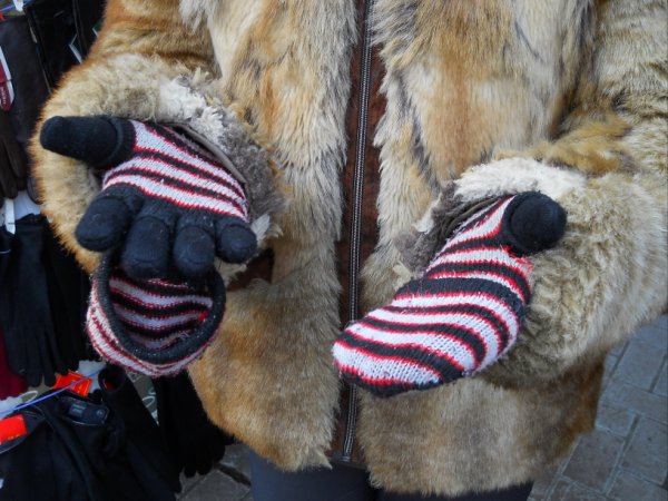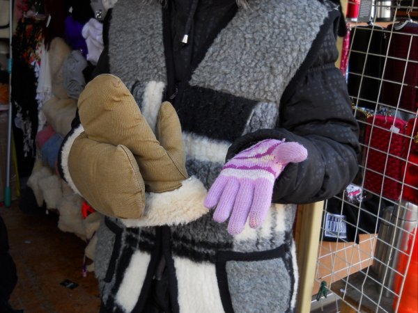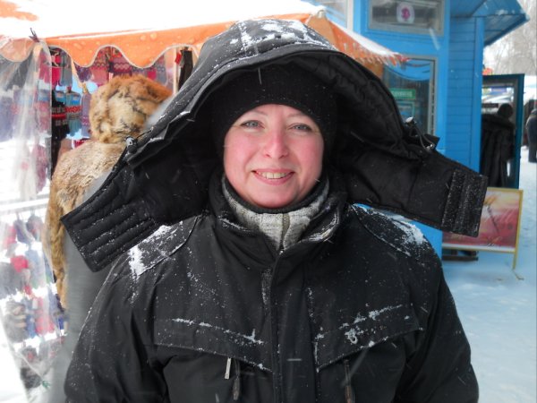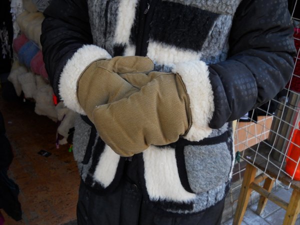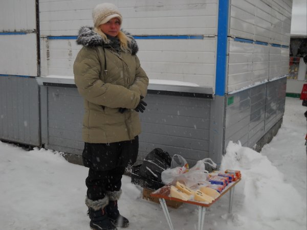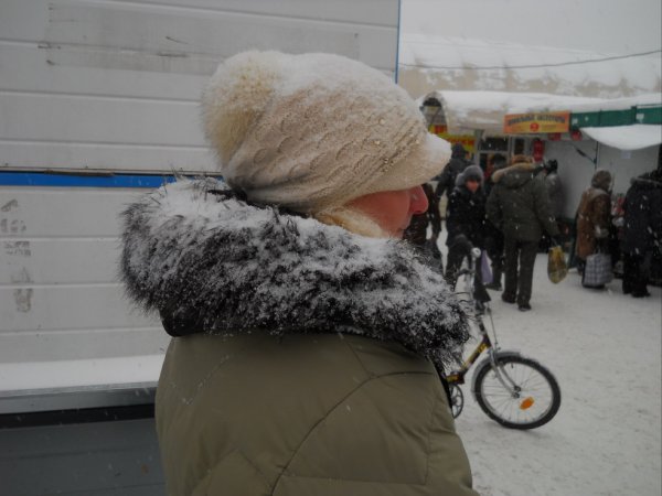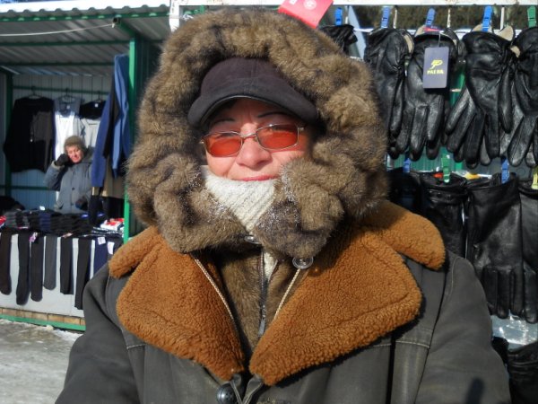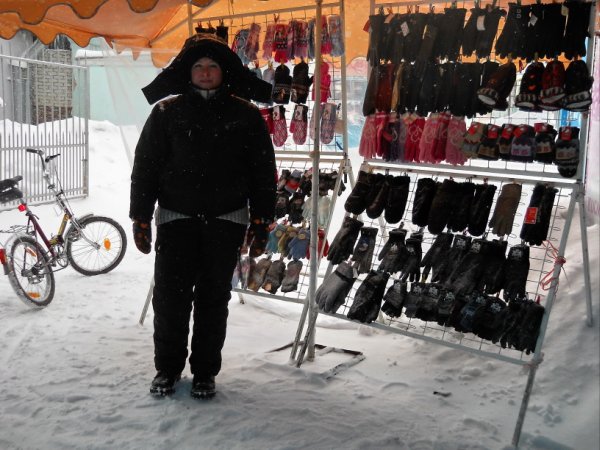 Наташа, продавец: вышла на работу к 9.30. Было 20 градусов. У нас за выход на мороз никаких доплат нет. А вот, расходы есть – чай и кофе, вроде, мелочь, но денег стоят. Стараюсь выходить стоять на солнечной стороне. На мне шапочка и капюшон, два свитера, куртка, жилет, шарф. Под утепленными спортивками колготы. На руках перчатки и теплые меховые варежки. Утепленные сапоги на один носок.